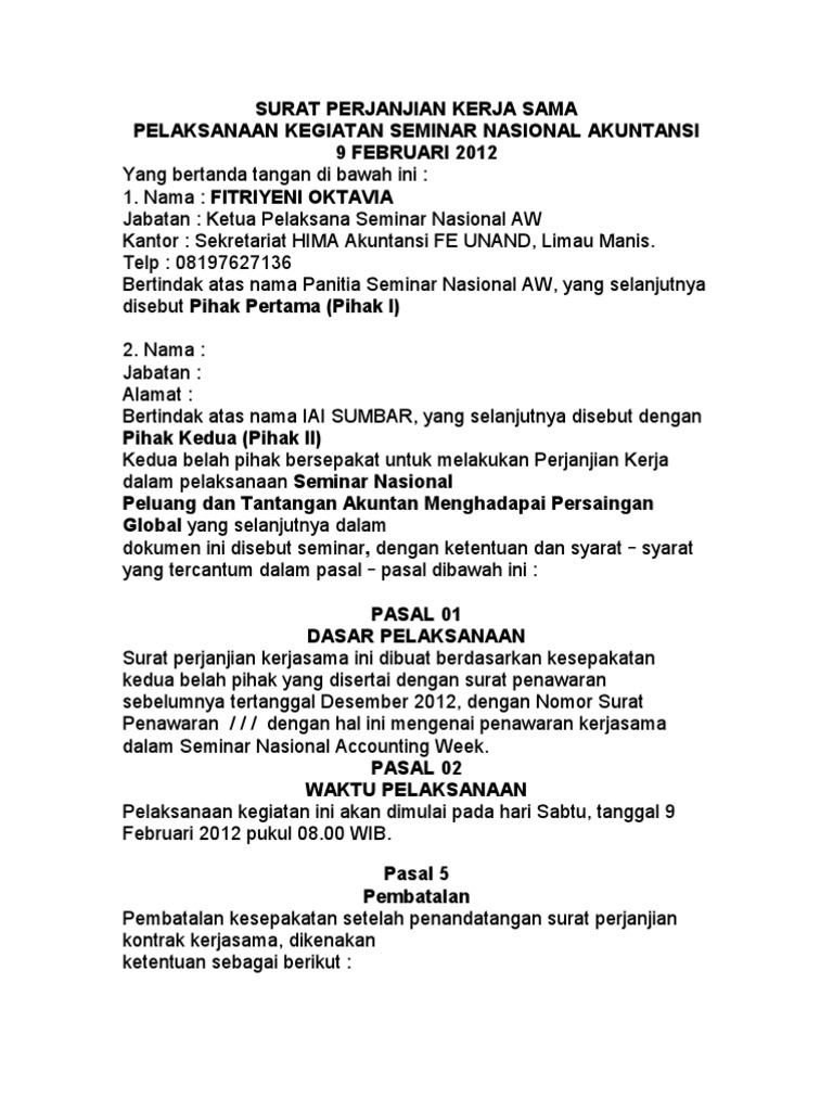 Surat kontrak kerjasama memiliki banyak variasi bentuk serta tujuan dari pembuatannya. Atas kesepakatan para pihak, kontrak dapat diperpanjang waktunya dan/atau ditambahkan nilai uang pokok investasi yang diatur dalam kontrak. Kontrak kerja sangat penting kedudukannya. We have 12 images about contoh kontrak kerjasama including images, pictures, photos, wallpapers. Surat perjanjian / kontrak kerja kontrak kerja ini dibuat sebagai bentuk perjanjian kerja antara dua belah pihak, dibuat sebanyak rangkap 2 (dua) dengan memiliki kekuatan… Kesepakatan kerja sama antara pihak pertama dan pihak kedua adalah dalam kegiatan. Pasal kerja sama penerbitan antara penerbit dan penulis sebagai berikut: Kontraktor kontrak kerja sama (kkks) adalah pihak yang memiliki kontrak kerja sama dengan pemerintah ri (skk migas), merupakan badan usaha tetap atau perusahaan pemegang hak pengelolaan dalam suatu blok atau wilayah kerja yang memiliki hak untuk melakukan kegiatan. Kontrak lisan (verbal) adalah kontrak atau perjanjian kerjasama yang dibuat oleh para pihak cukup dengan lisan atau kesepakatan para pihak (pasal 1320 kuhp). Contoh surat perjanjian kerjasama dengan eo weddingdeskripsi lengkap. Contoh surat mou (memorandum of understanding). Surat perjanjian kerjasama atau memorandum of understanding (mou) ini dalam dunia bisnis sering dijadikan sebagai dokumen. Surat kontrak kerjasama event organizer.