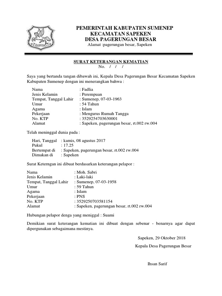 Tag contoh surat keterangan ahli waris dari kepala desa download kumpulan gambar Pagi ini saya akan kembali membagikan sebuah contoh surat keterangan, namun pada postingan sebelumnya saya juga telah memberikan beberapa contoh surat keterangan karyawan.bagi sahabat yang membutuhkan bisa langsung menuju postingan tersebut. Surat kematian sangatlah penting digunakan untuk berbagai keperluan, dan keluarga yang ditinggalkan bisa membuat surat kematian di rt rw, kelurahan maupun surat kematian. Suwadji hadi siswanto nik : Surat kematian sangatlah penting digunakan untuk berbagai keperluan, dan keluarga yang ditinggalkan bisa membuat surat kematian di rt rw, kelurahan maupun surat kematian.