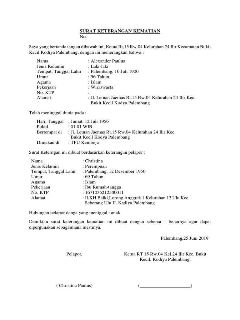 Surat kematian sangatlah penting digunakan untuk berbagai keperluan dan keluarga yang ditinggalkan bisa membuat surat kematian di rt rw kelurahan maupun surat kematian. Surat kematian sangatlah penting digunakan untuk berbagai keperluan, dan keluarga yang ditinggalkan bisa membuat surat kematian di rt rw, kelurahan maupun surat kematian. Download contoh surat keterangan kematian dari kelurahan. Adapun syarat ketentuan penyaluran dana punia kematian diatur dalam perkel nomor 12 tahun 2020. Demikian ulasan tentang surat keterangan kematian yang merupakan alternatif dari akta surat kematian.