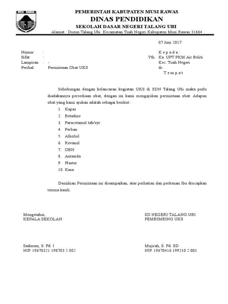 Lihat juga semua yang berkaitan dengan pmr dilink ini, silahkan klik disini. Pemerintah kabupaten blitar dinas pendidikan uptd bakung sd negeri sidomulyo 02 jalan trisula desa sidomulyo kecamatan bakung surat … 100% (1) 100% found this document useful (1 vote) 2k views 2 pages. Surat permohonan obat dapson kepada, yth _____ dengan surat ini kami mengajukan permintaan obat dapson 100 mg, dengan dosis 1 tablet (100 mg) per hari, untuk … Contoh surat permohonan dana #2.